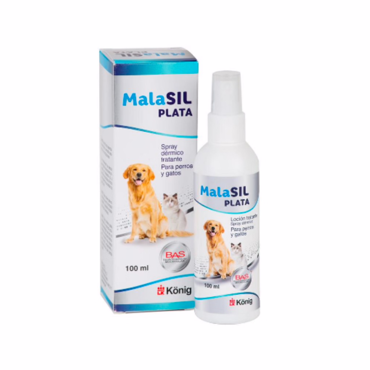 MalaSIL Plata® loción spry es el complemento de elección para combatir las afecciones producidas por Malassezia sp., una levadura que normalmente se encuentra en la piel de los animales causante de la dermatitis seborreica; también ayuda con infecciones secundarias de otros microrganismos que afectan a la piel y el pelo. La acción de la plata micronizada, como uno de sus componentes principales, evita la formación de biofilm y la adhesión de bacterias, hongos y levaduras. Además, contiene aceites esenciales de reconocida actividad dermatológica que junto con el Ichthyol y el pidocanol disminuyen los síntomas más molestos como picazón, enrojecimiento y descamación de la piel y pérdida de pelo