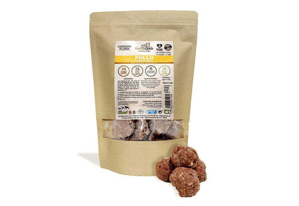 Menú completo, fresco y monoproteico de pollo. Es la fuente de proteína más magra que se recomienda para las mascotas propensas al aumento de peso. Es de fácil digestión y contiene el nivel más bajo de proteína, que es ideal para mascotas que padecen enfermedad hepática o renal. Bajo en sodio, alto en potasio y con altos niveles de vitamina A. Suele ser la primera opción para la transición a BARF. Opción de elección ante alergia a otras fuentes proteicas.