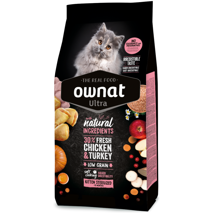 Indicado para gatitos esterilizados de hasta 12 meses. Con un 30 % de carne fresca de pollo y pavo, ofrece un aporte de proteínas elevado con un bajo valor calórico, que garantizan su óptimo crecimiento evitando el sobrepeso. Contiene aceite de salmón como fuente de ácidos grasos omega-3 (DHA) para ayudar al desarrollo cerebral y promover una visión saludable.